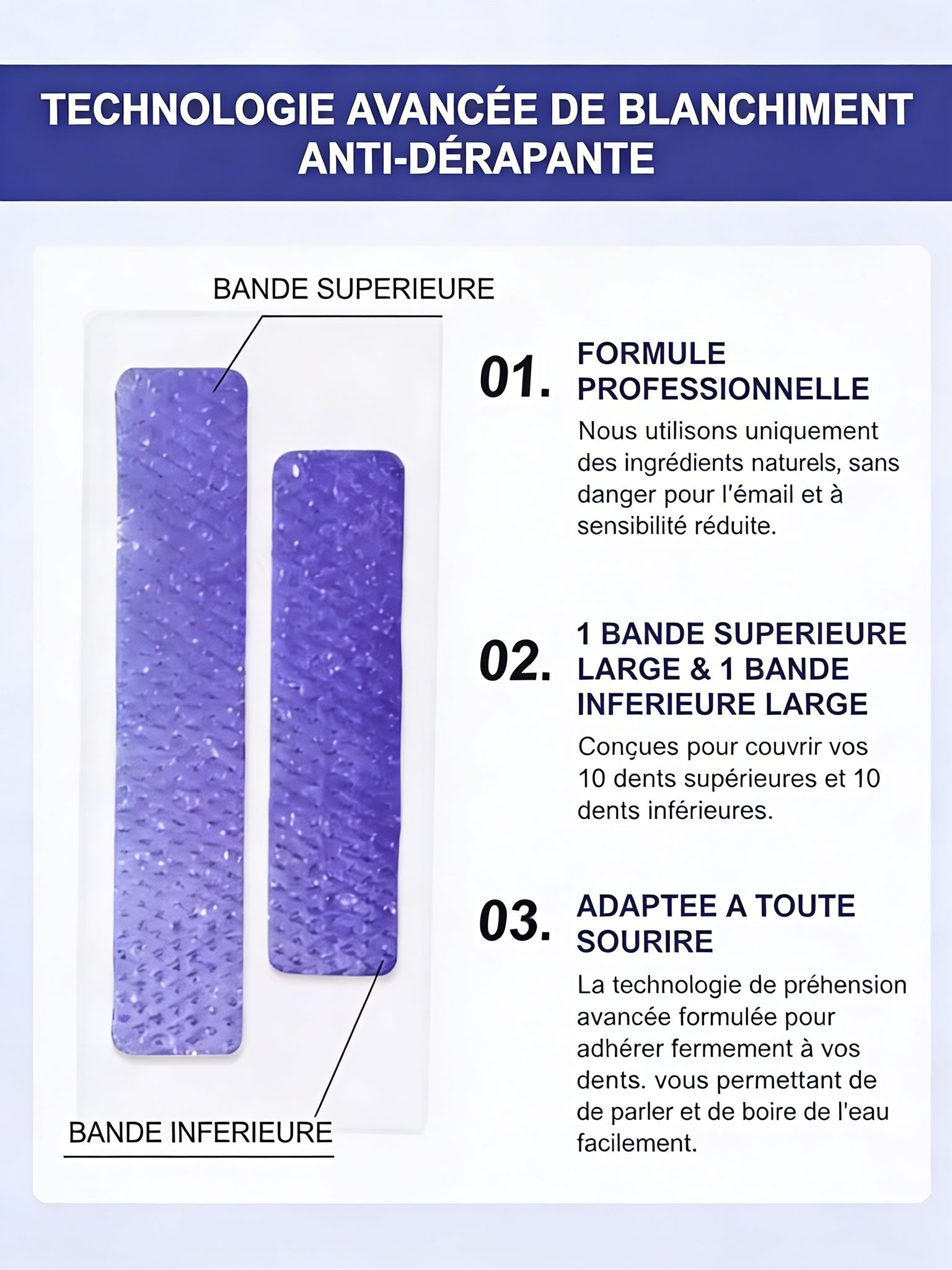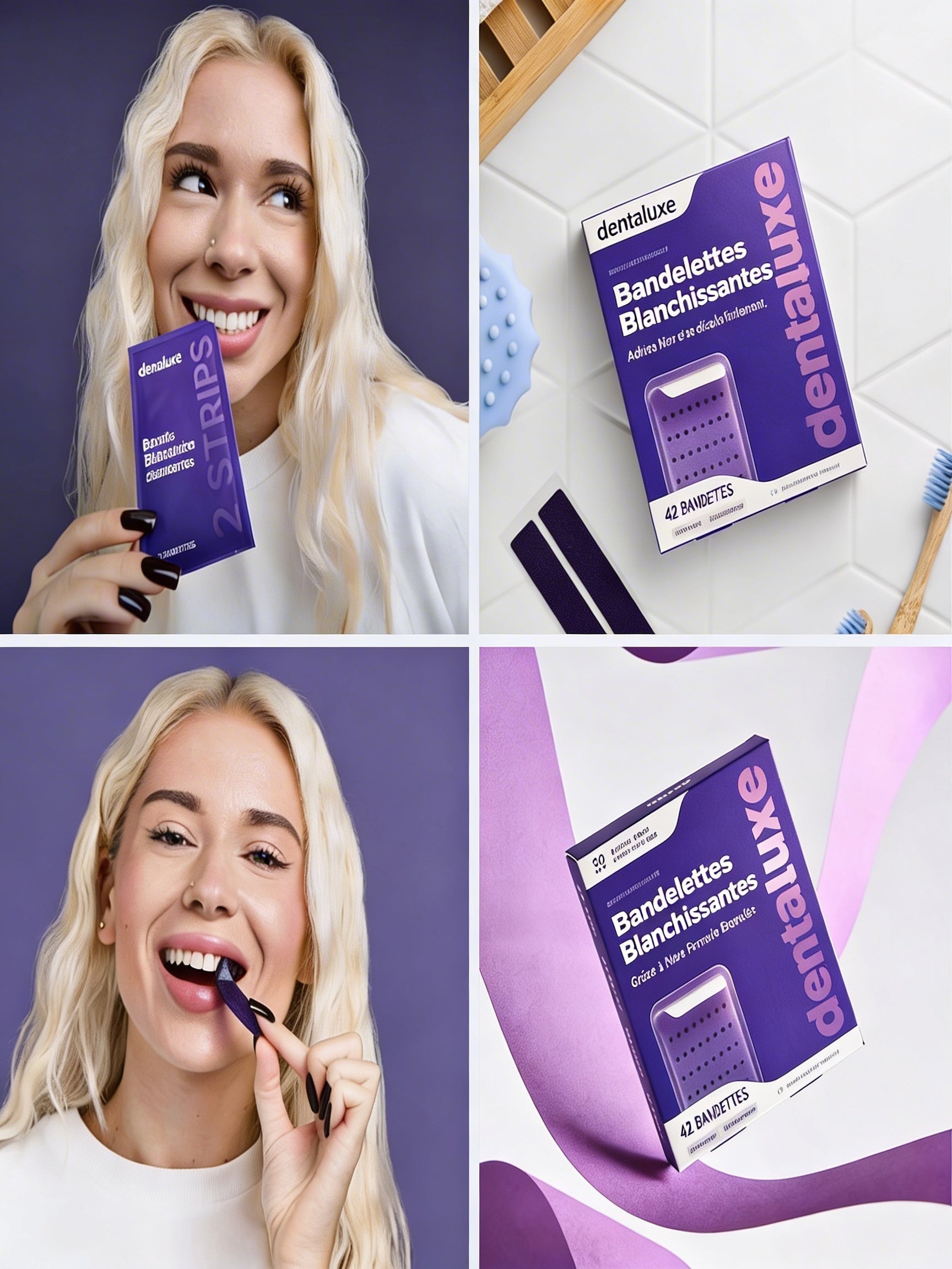 Découvrez les bandes blanchissantes violettes DENTALUXE. Une innovation révolutionnaire pour un blanchiment instantané et des résultats visibles dès leur application.